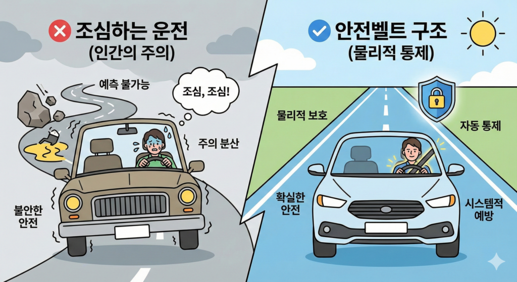 - “안전벨트·에어백·차로이탈방지 시스템” → 실수해도 피해를 줄이는 구조